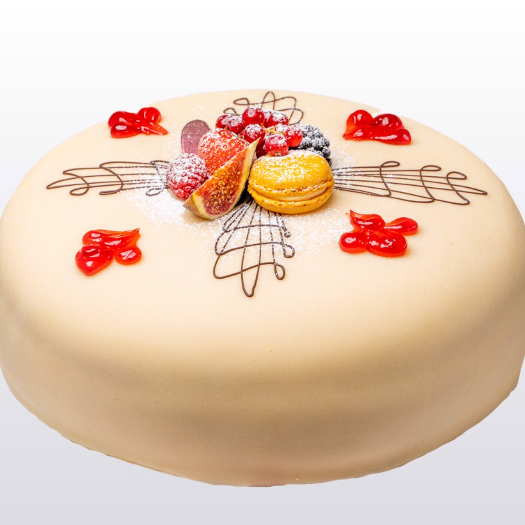 Vår marsipankake er en klassisk kremkake fylt med frisk frukt og bær, som gir en herlig balanse mellom sødme og friskhet. Kaken er svøpt i et lokk av fersk og myk marsipan som gir en delikat og elegant finish. Perfekt til alle typer feiringer!